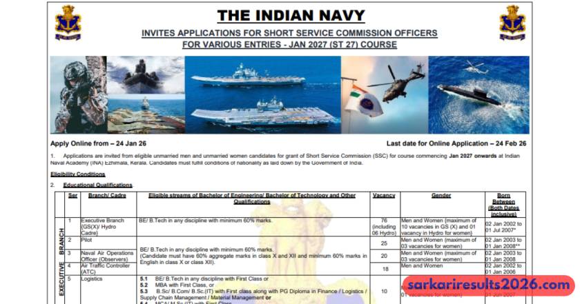 Dreaming of a thrilling career defending India’s shores? The Indian Navy SSC Officer Recruitment 2026 for the JAN 2027 (ST 27) Course, offering 260 posts across Executive, Technical, and Education branches. This short service commission opportunity is perfect for young graduates eager to serve with honor, adventure, and top-notch perks. Applications open soon via joinindiannavy.gov.in – no application fee for anyone! For the latest updates, head to www.sarkariresults2026.com, your go-to for sarkari job alerts.