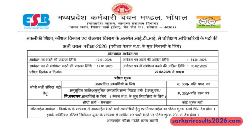 MP ITI Training Officer Recruitment 2026: Are you eyeing a stable career in Madhya Pradesh’s education sector? The Madhya Pradesh Employees Selection Board (MPESB) has just dropped a massive recruitment drive for ITI Training Officers. With 1120 posts up for grabs, this is your chance to join as a training expert in industrial training institutes. Released on January 15, 2026, the notification invites applications from qualified candidates across India. Head over to www.sarkariresults2026.com for quick updates and links to make your application seamless.