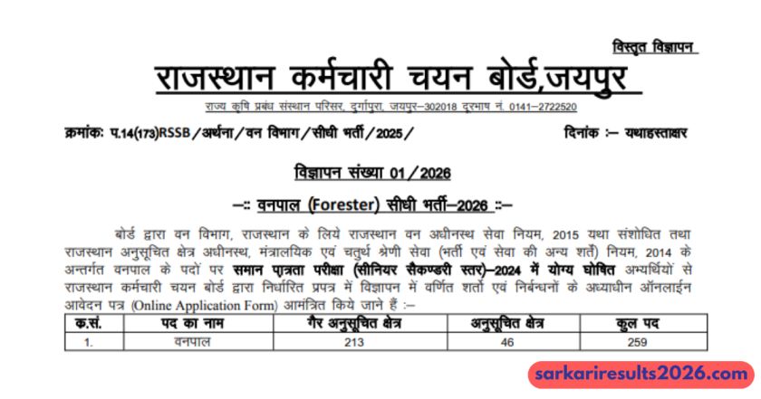 Are you passionate about protecting Rajasthan’s lush forests and wildlife? The Rajasthan Staff Selection Board (RSSB) has just dropped an exciting opportunity with its Forester (Vanpal) RSSB Forester Recruitment 2026. This isn’t just another job; it’s a call to adventure in nature conservation. With 259 posts up for grabs, it’s your shot at a stable government career. Released in early January 2026, applications are live now. We’ll break it down simply, so you can decide if it’s for you. For real-time alerts, check www.sarkariresults2026.com.